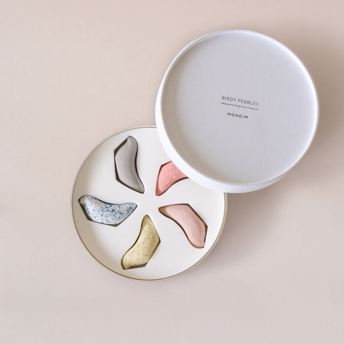 オブジェとして飾りたくなるような愛らしいBIRDY PEBBLESは一つ一つ手作りで、表面の模様もそれぞれ。スウィーツのようなパッケージに並んだ5つのセットで、新居祝いや結婚祝いのギフトにもぴったり。