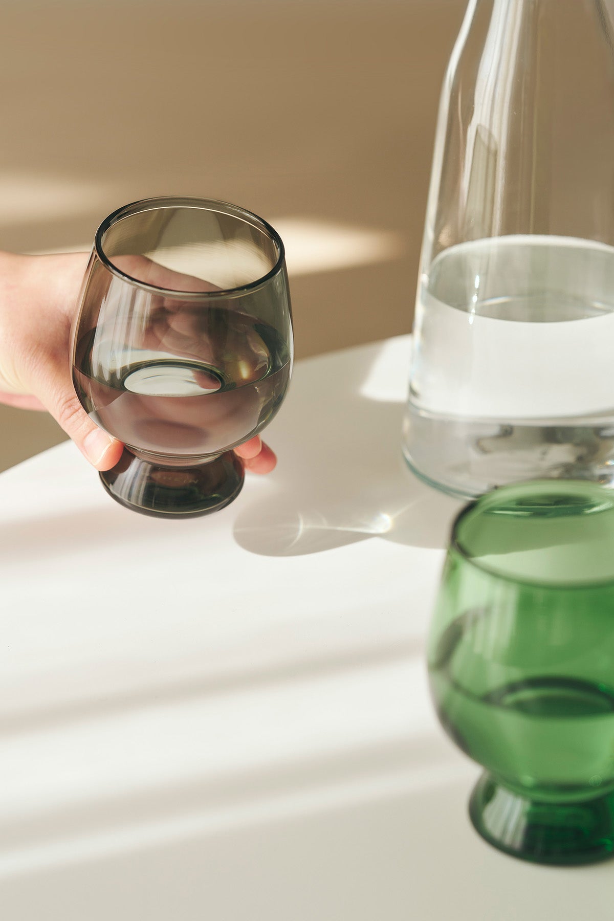カラーはclear、amber、green、smoke、cobaltの全5色。それぞれ落ち着きのあるカラーバリエーションで、amberやcobaltはどこかレトロな雰囲気も感じさせる色味です。色違いで組み合わせてもしっくりくるカラーリングになりました。