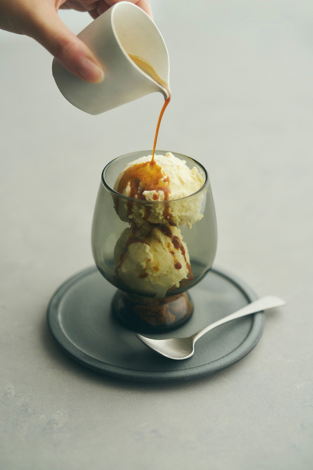 容量は満水で約355ml。脚つきのデザインは、ドリンクだけではなく、ちょっとしたスイーツやパフェなどにも使えるフォルムとサイズ感。「気取らずに日常使いしたくなるグラス」であること、そして、「注ぐもの・中に入れるものを特別にしてくれるようなデザイン」を考えました。
