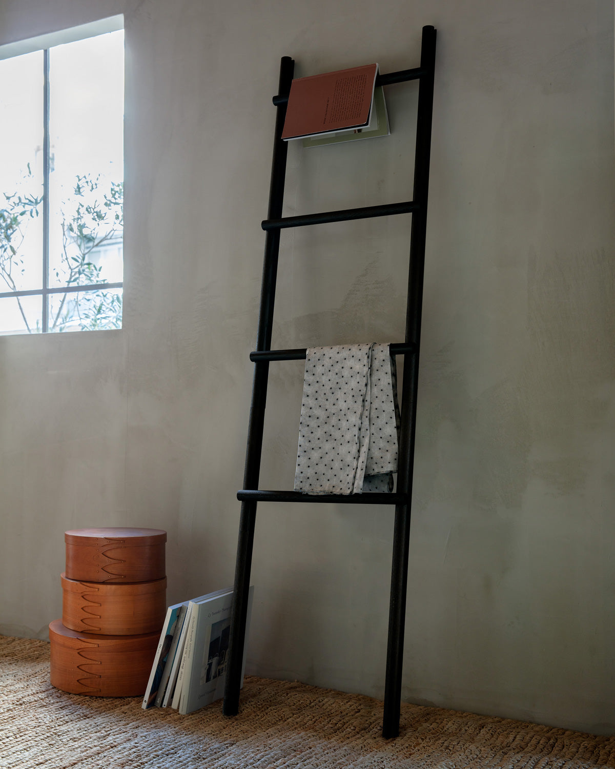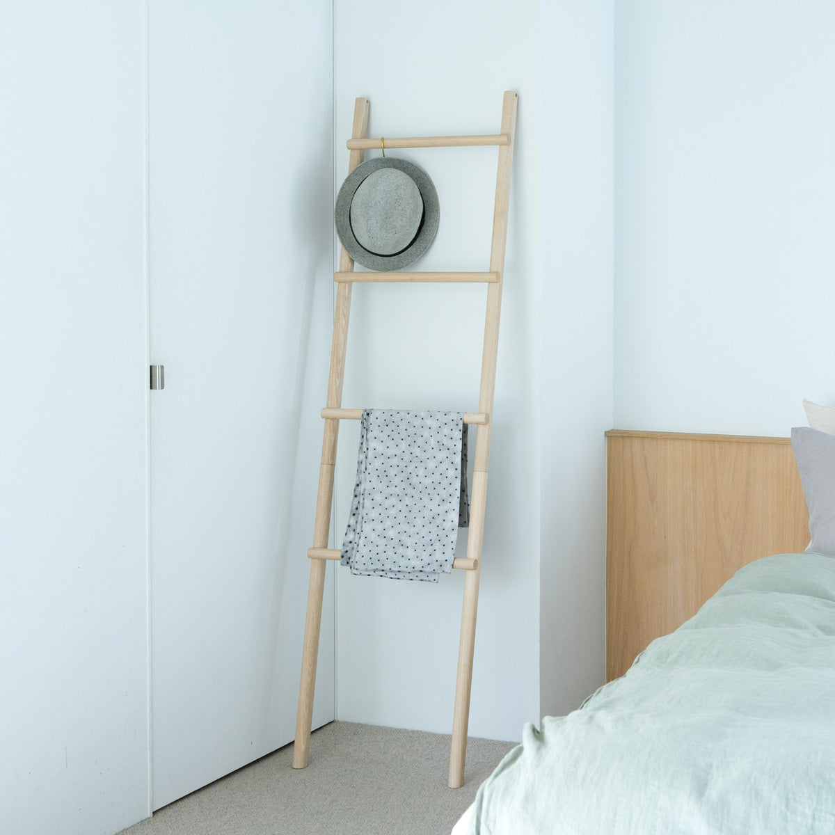 女性でも簡単に運べる軽さと、空間を邪魔しないシンプルなデザイン。最上部にはくぼみがあり、ハンガーなどを引っかけられます。LADDER RACKはバスルームやクローゼット、リビングやベッドルームの衣服や小物を飾るようにすっきり片付けてくれます。