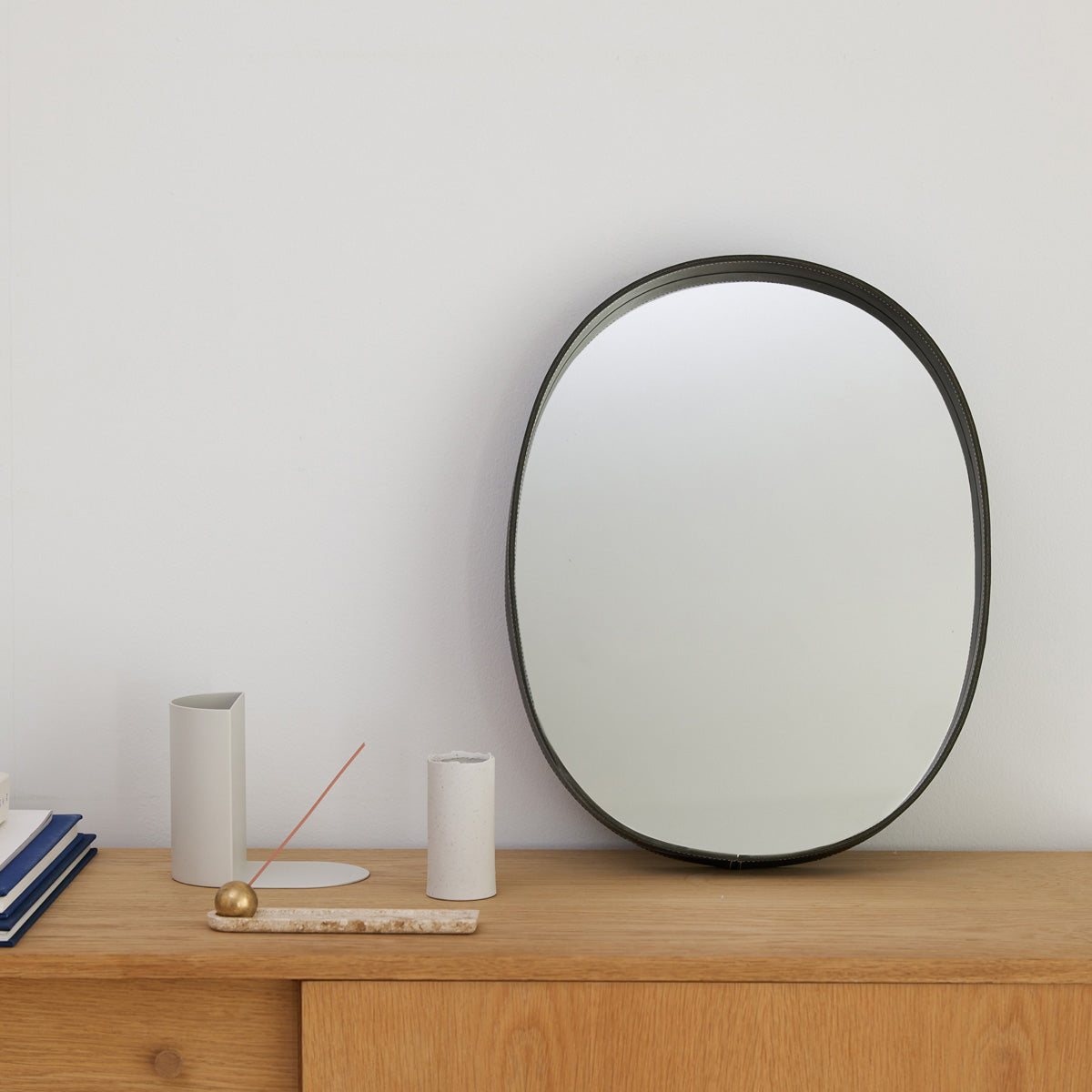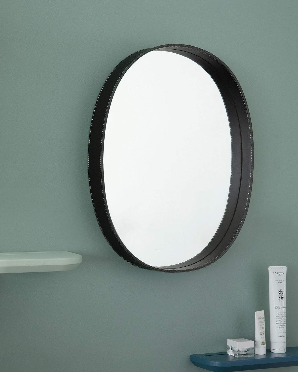 懐かしさを感じられるような楕円のかたちが、レザーのフレームと合わさることで、現代の空気をまとった上品なウォールミラーに仕上がりました。