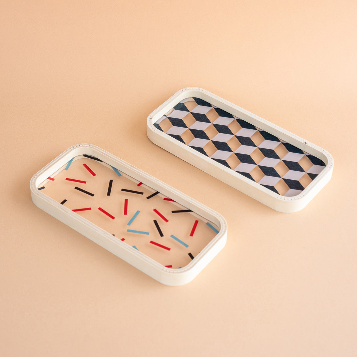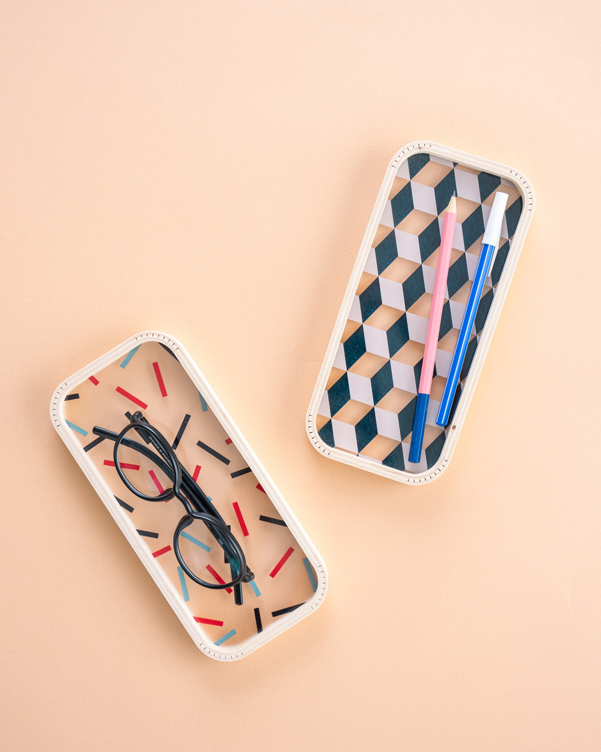 アクリルと木の異素材を組み合わせたペントレイ。曲木のフレームと透明なアクリルやストライプの上にペンや鍵を置けば、それだけで遊び心を感じられる存在に。