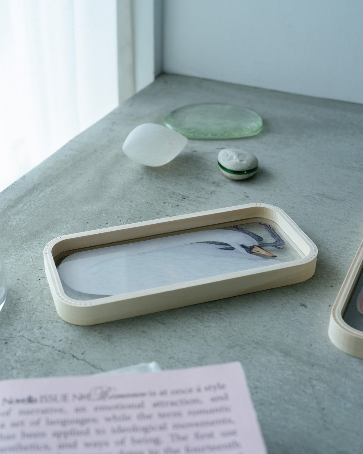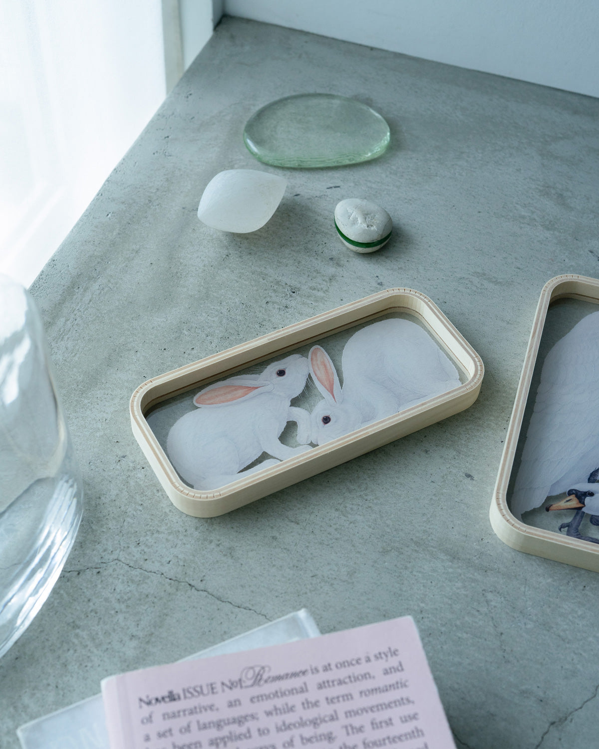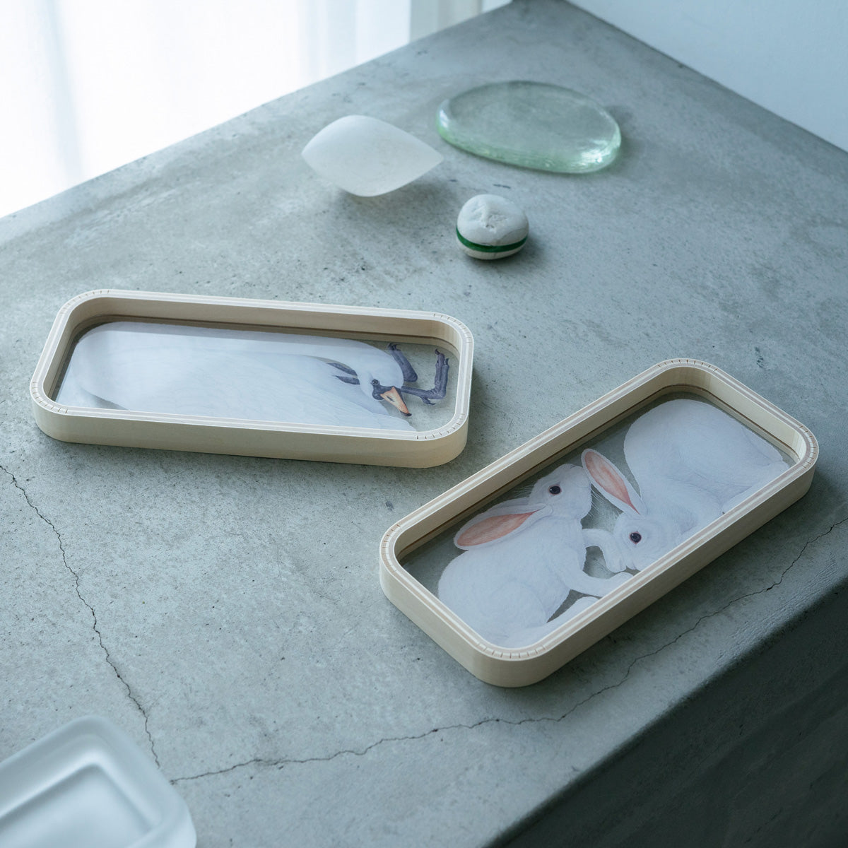 毛並みがそれぞれ精細に表現されており、トレイの下に落ちる影までも引き立たせるよう意識して描かれました。白い動物たちの上は、細かなアクセサリーや繊細なジュエリーのための場所にしてみるのもいいかもしれません。