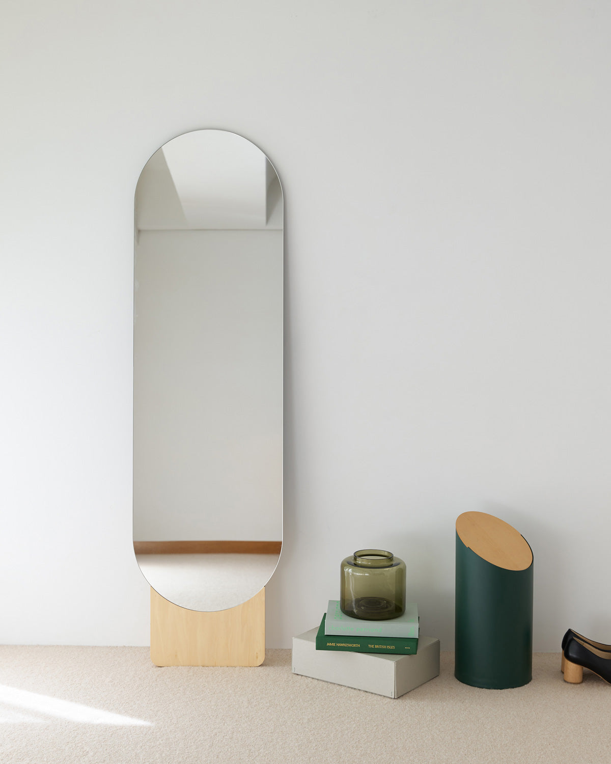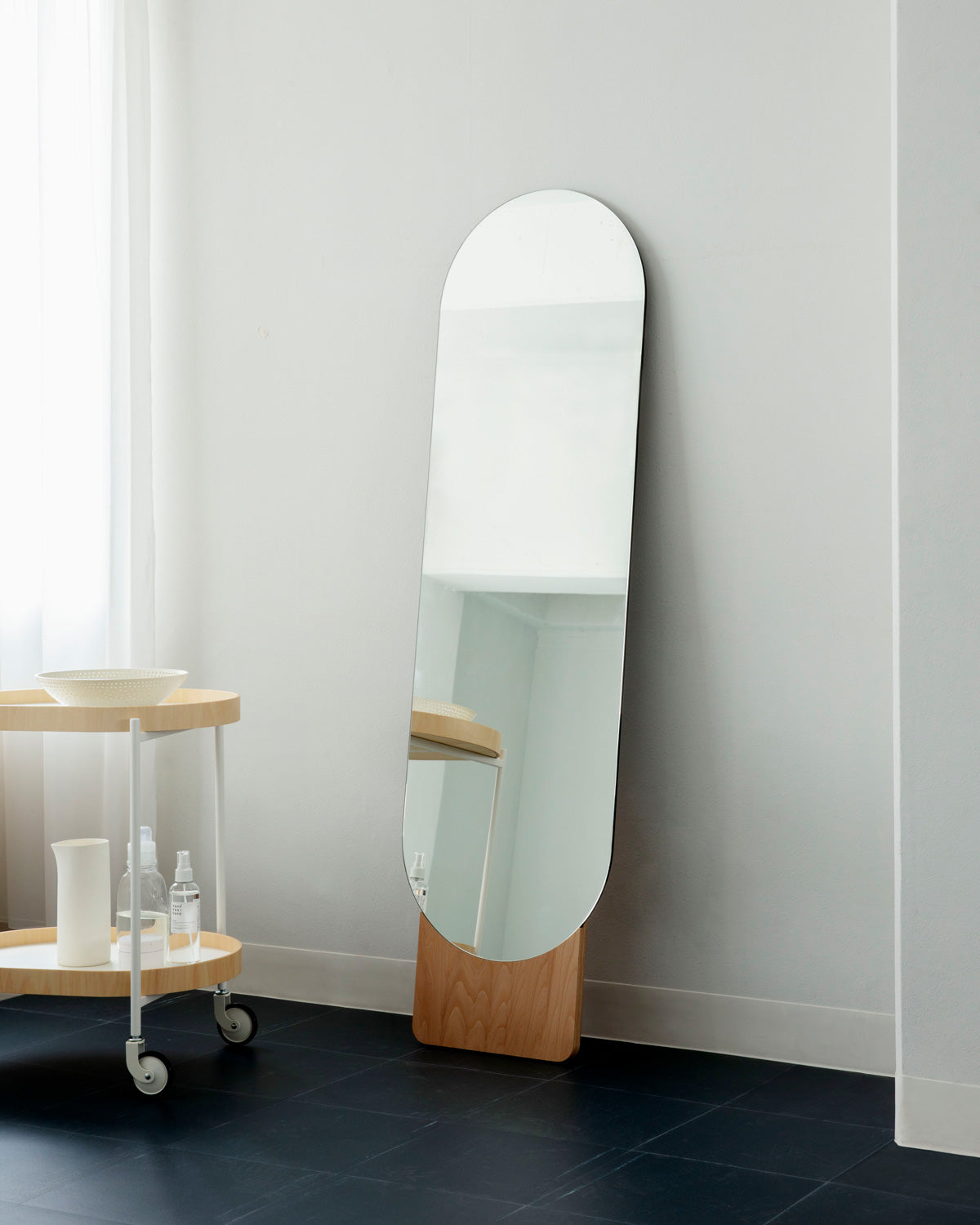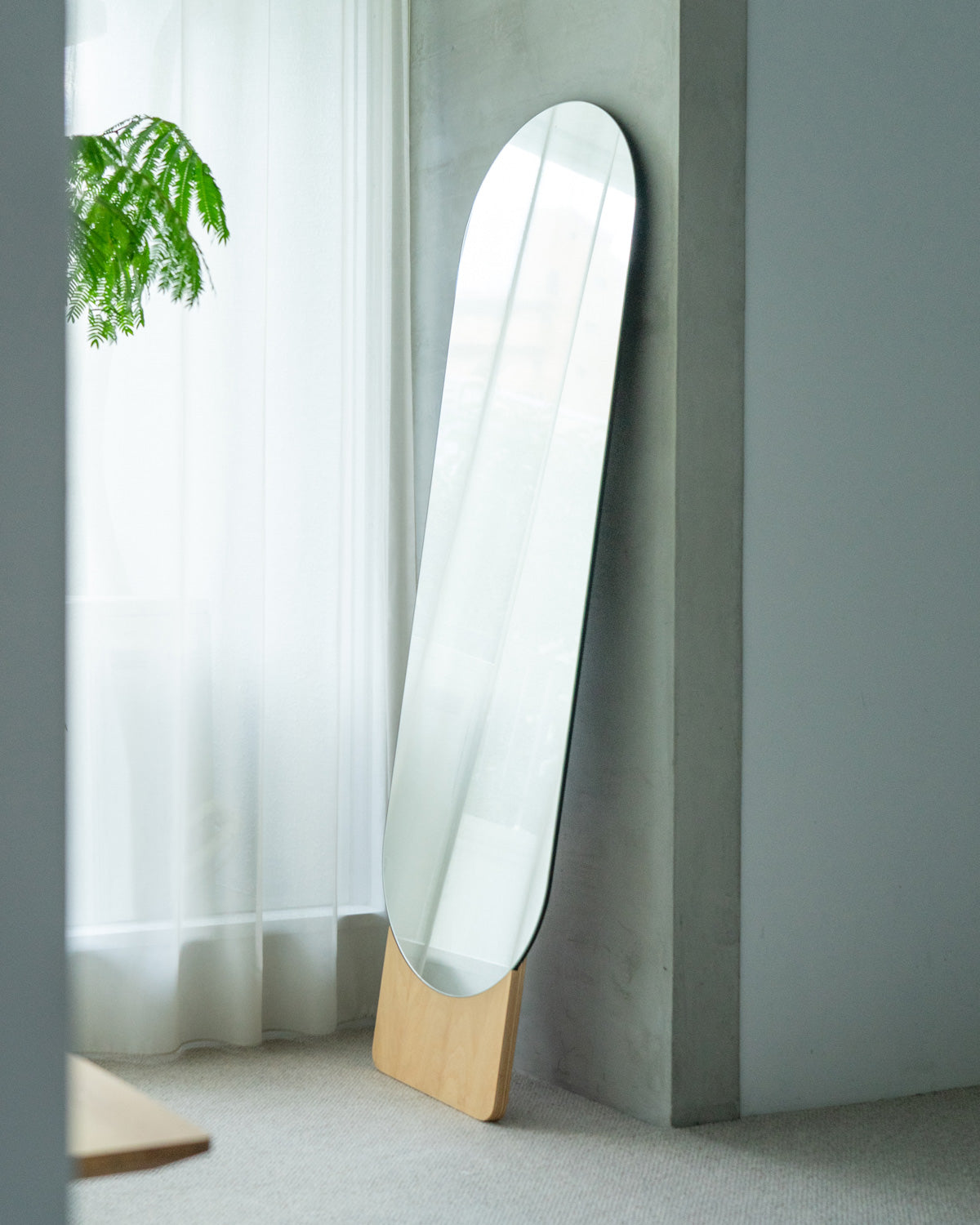 優美な丸い鏡の形状と木の直線的なラインが、シンプルでありながら個性的な存在感を作り上げています。